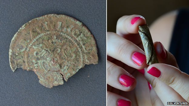 The Nuremburg jetton (left) and the rolled curse tablet were found during the two-week dig