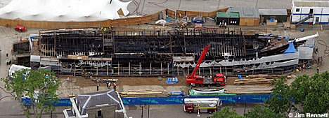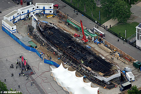 A huge plume of smoke rose from the charred wreckage this morning. The metal framing around the ship was warped and twisted from the intense heat. The ship's timbers would have been impregnated with tar and this could have helped the fire spread.