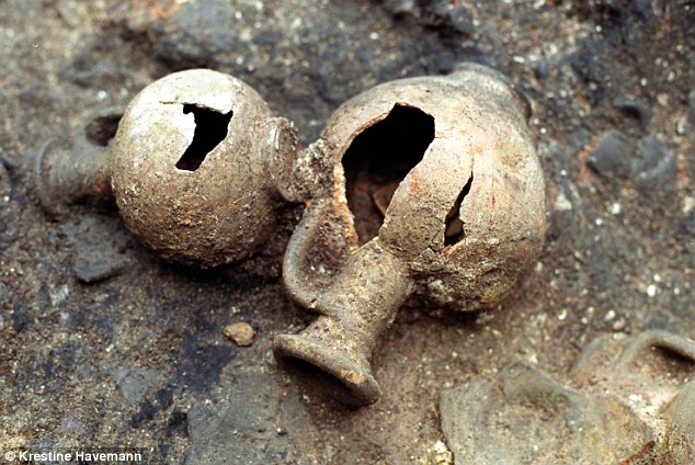 Unearthed: The Lidar technology helps archaeologists trace the roads because they were originally raised about 20in above the ground. Although they have now been eroded by hundreds of years of rain and farming work, sections of the roads remain raised enough for the lasers to detect (file image of Roman jugs)