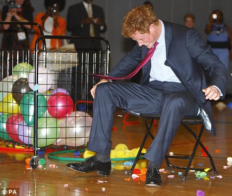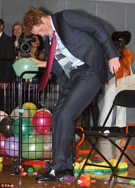Beat you! Harry pops the balloon, but Lesotho's Prince Seeiso (left) defeats him