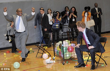 Prince of pop: A gleeful Harry finishes the obstacle course by sitting on a balloon to burst it during his visit to the Harlem Children's Zone in New York yesterday