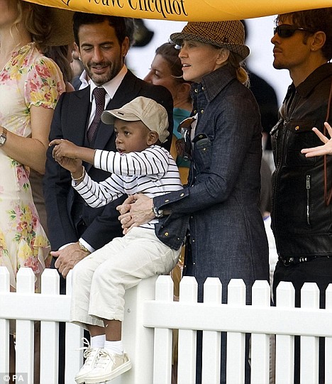 Celebrity guests: Madonna and her adopted son David Banda watch the match with designer Marc Jacobs, left. Her son Rocco was there too