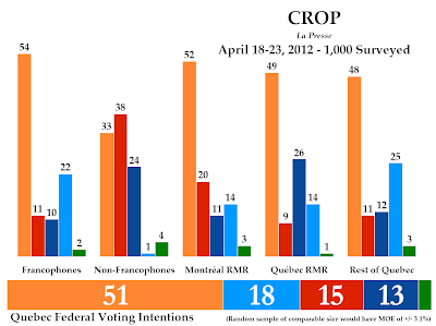 The CROP poll published by La Presse puts the NDP at a massive 51% - a gain of 22 points since CROP's last poll from mid-March.