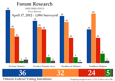 The Conservatives lead in eastern Ontario, in the GTA as a whole (though only in the 905 area code), and in southwestern Ontario. The New Democrats are ahead in northern Ontario, while the Liberals lead in the City of Toronto.