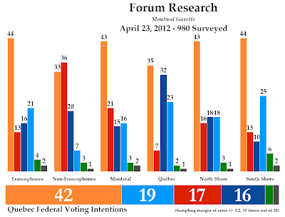 Forum's latest missive for the Montreal Gazette was taken on the last day of CROP's polling, so it is newer. Though it has the NDP a little lower, it is still showing the same landslide: 42% for the NDP, 19% for the Bloc, 17% for the Liberals, and 16% for the Conservatives.
