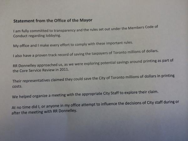 Mayor Rob Ford's official statement on allegations he breached the code of conduct