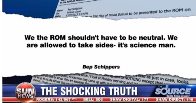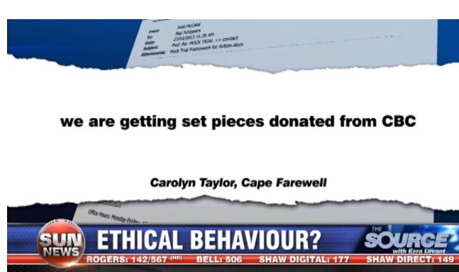 In what should obviously be a firing offence, Sun News’ Ezra Levant exposes CBC employee Laurie Brown using her contacts and associations to obtain the usage of CBC stage and set materials in order to supply the David Suzuki mock trial she was organizing: