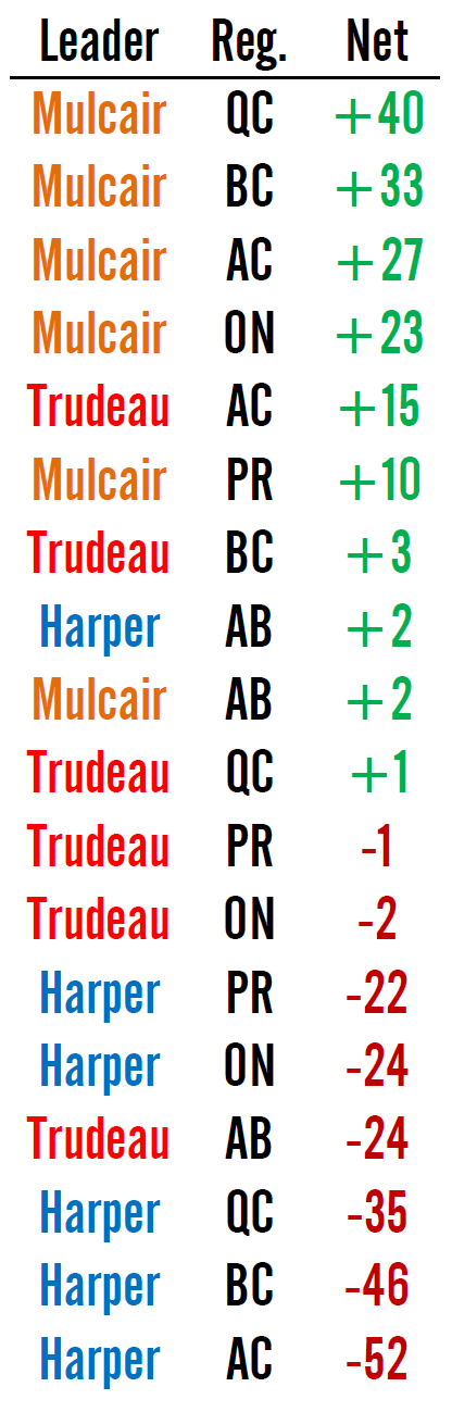 A Globe and Mail/Nanos Research poll asked 1,000 Canadians last week how the election of each of the three main party leaders would affect the economy. And 47 per cent said a Mulcair victory would have a “positive” or “somewhat positive” impact. That was well ahead of Conservative Prime Minister Stephen Harper’s 31.7-per-cent positive result. Liberal Leader Justin Trudeau garnered 41.4 per cent.