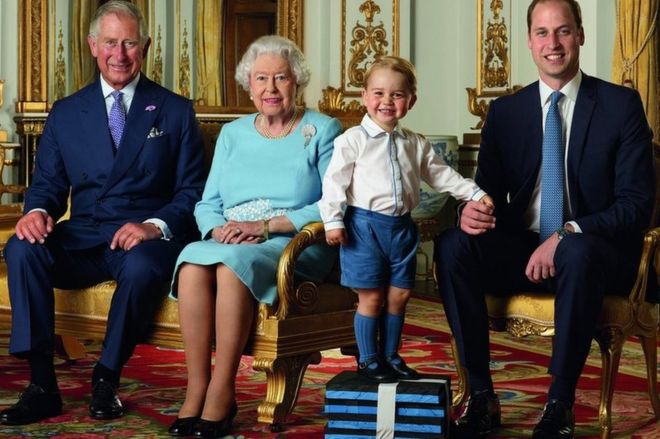 The portrait, which was taken in the White Drawing Room of Buckingham Palace in the summer of 2015, shows Queen Elizabeth II with her three immediate heirs - her son Prince Charles; grandson Prince William; and great-grandson Prince George.
