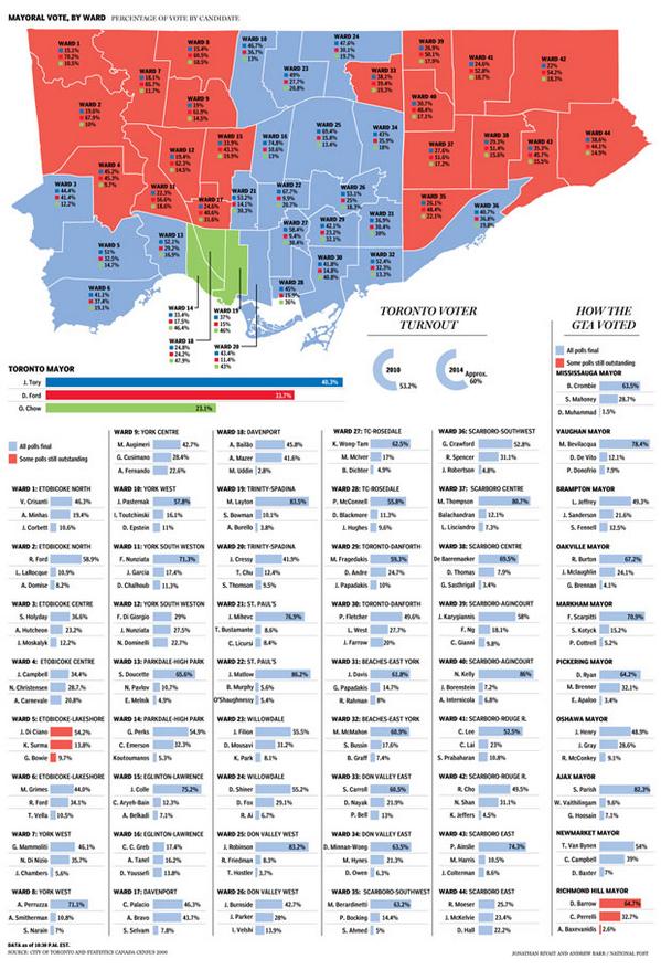 Rob Ford and his nephew both win, Rob will run again in 4 years. Doug did a last-minute stand-in bang-up job for his brother.
