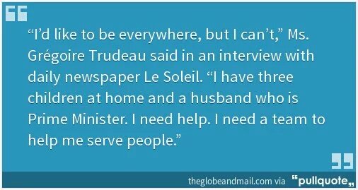 Speaking in Quebec City earlier this week, Ms. Grégoire Trudeau bluntly said she and her current assistant can’t manage the number of demands that come from being a high-profile, bilingual and much sought-after speaker. Various groups and charitable organizations regularly invite Ms. Grégoire Trudeau to promote their causes, but the constant requests are proving impossible to address under current circumstances, she said.