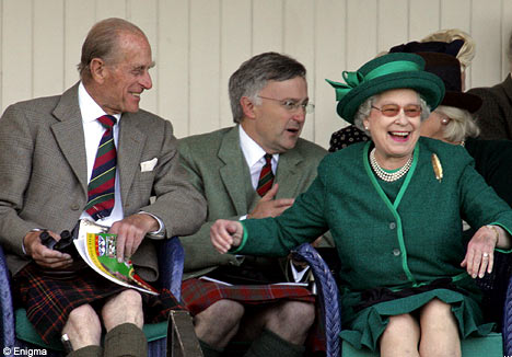 The Queen shares a joke with Prince Philip, wearing a kilt