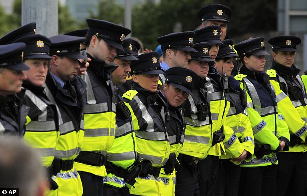 The Queen being handed a wreath and (right) armed Irish police officers guard the Irish War Memorial Gardens