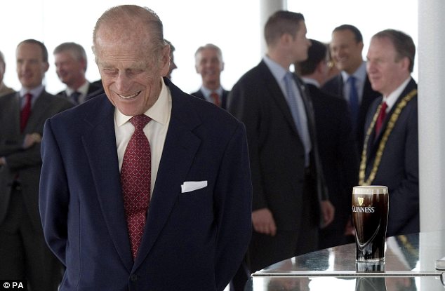 Looks tempting: Prince Philip eyes a pint of Guinness as he and the Queen tour the storehouse in Dublin