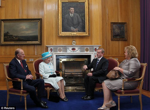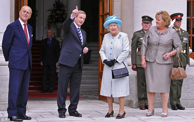 On arrival at Dublin yesterday, the Queen - appropriately wearing emerald green - was greeted as she got off the plane by Irish President Mary McAleese. She was then driven in a bulletproof and bombproof car to the Áras an Uachtaráin in Dublin's Phoenix Park, the splendid white building from which the British used to govern Ireland but which is now the official residence of the President of the Republic of Ireland. It was there that she was greeted by the Irish Taoiseach (Prime Minister) Enda Kenny.