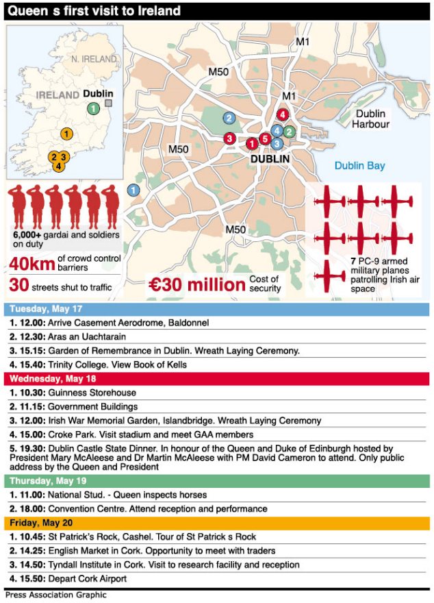 Mr Cameron will hold talks with Taoiseach Enda Kenny before joining the Queen and Duke of Edinburgh at a lavish state dinner at Dublin Castle hosted by President Mary McAleese in honour of the royal couple.