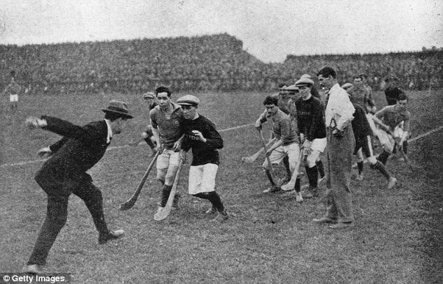 Sinn Fein leader Michael Collins throwing in the ball to start a hurling match at Croke Park in 1921. He had ordered the assassination of British spies the night before 'Bloody Sunday' the previous year