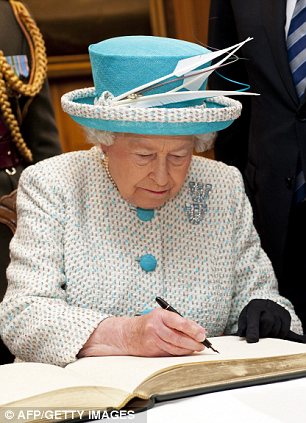 The Queen under a painting of Irish revolutionary leader Michael Collins and (right) signing the visitor's book