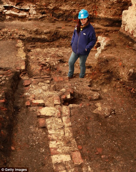 Archaeologist Heather Knight stands on the site in East London where the remains of the first Globe Theatre have been found. The curved line of bricks she is looking at is thought to be the inner wall next to where the audience would have stood