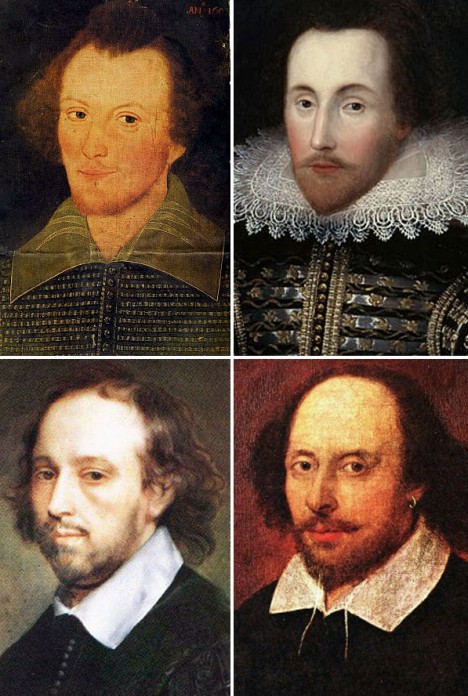 Four portraits of the Bard. Clockwise from top left, the Sanders portrait, thought to have been done in 1603 by John Sanders; the Janssen painting made in 1610; the Chandos portrait so named because it was once in the possession of the Duke of Chandos; and, finally, from the late 1660s this one by the Dutch-born artist Gerard Soest