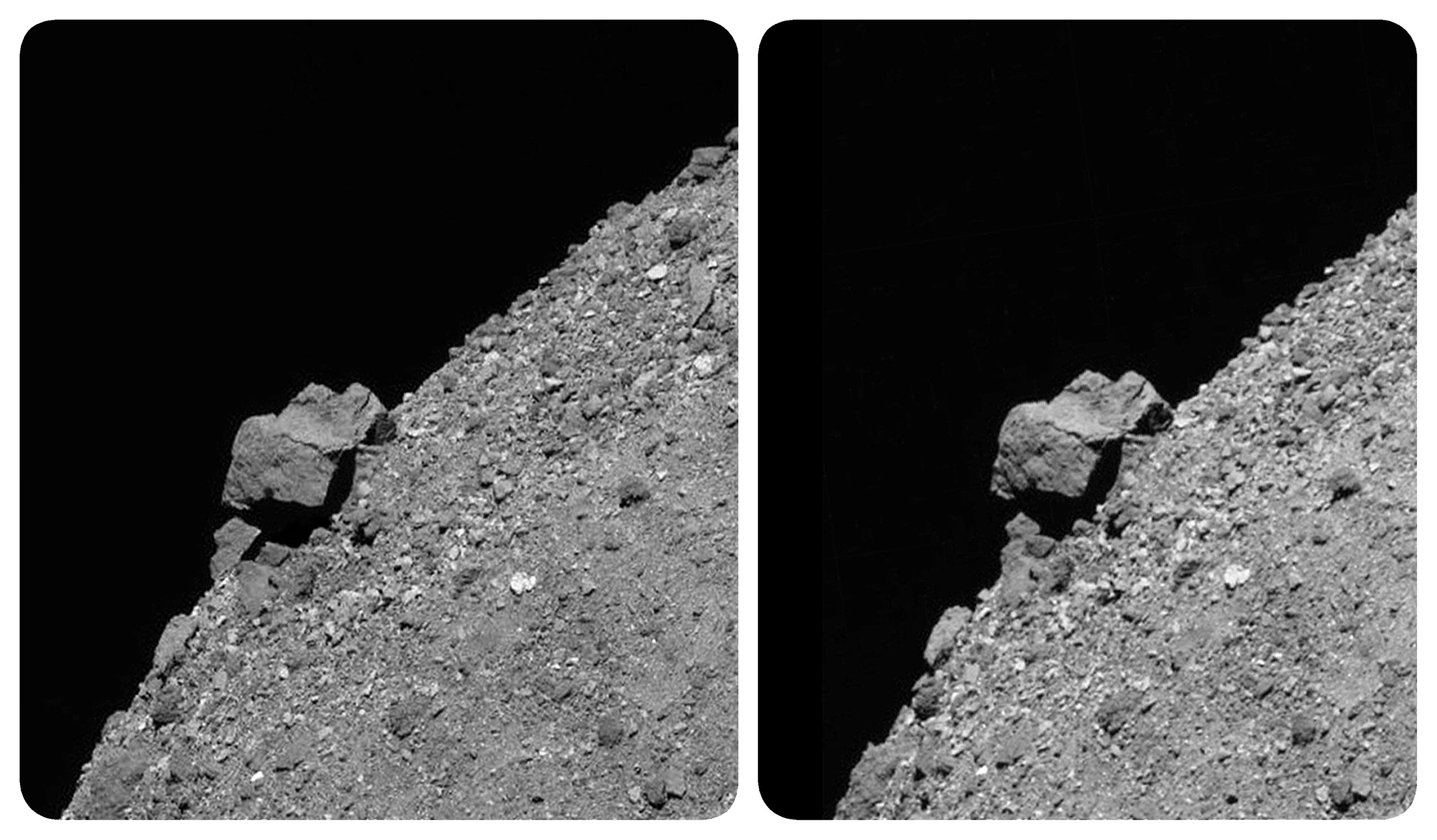 Photos released Wednesday focus on the even smaller space rock Bennu. The 3D images taken by NASA’s Osiris-Rex spacecraft, flying alongside Bennu, show a jagged boulder that’s 170 feet (52 metres) across.