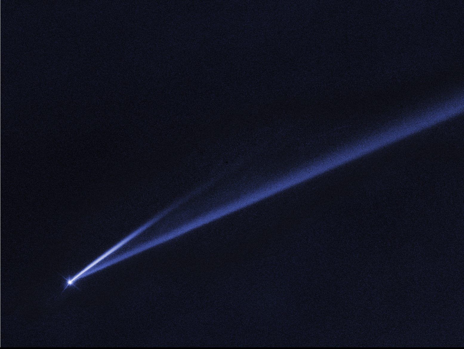 Thursday’s picture shows an asteroid coming apart at its dusty seams, courtesy of the Hubble Space Telescope. Two long comet-like tails are streaming from asteroid Gault, a 2.5-mile-wide (4-kilometre-wide) world that’s spinning so fast it’s shedding.