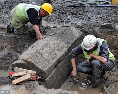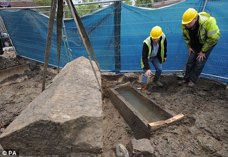 Archaeologists from Durham University clean a Roman Stone Sarcophagi which was uncovered at a dig on the site of former office buildings