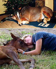 Curled up beneath a Christmas tree, Tom the horse looks the picture of peace and goodwill to all men.