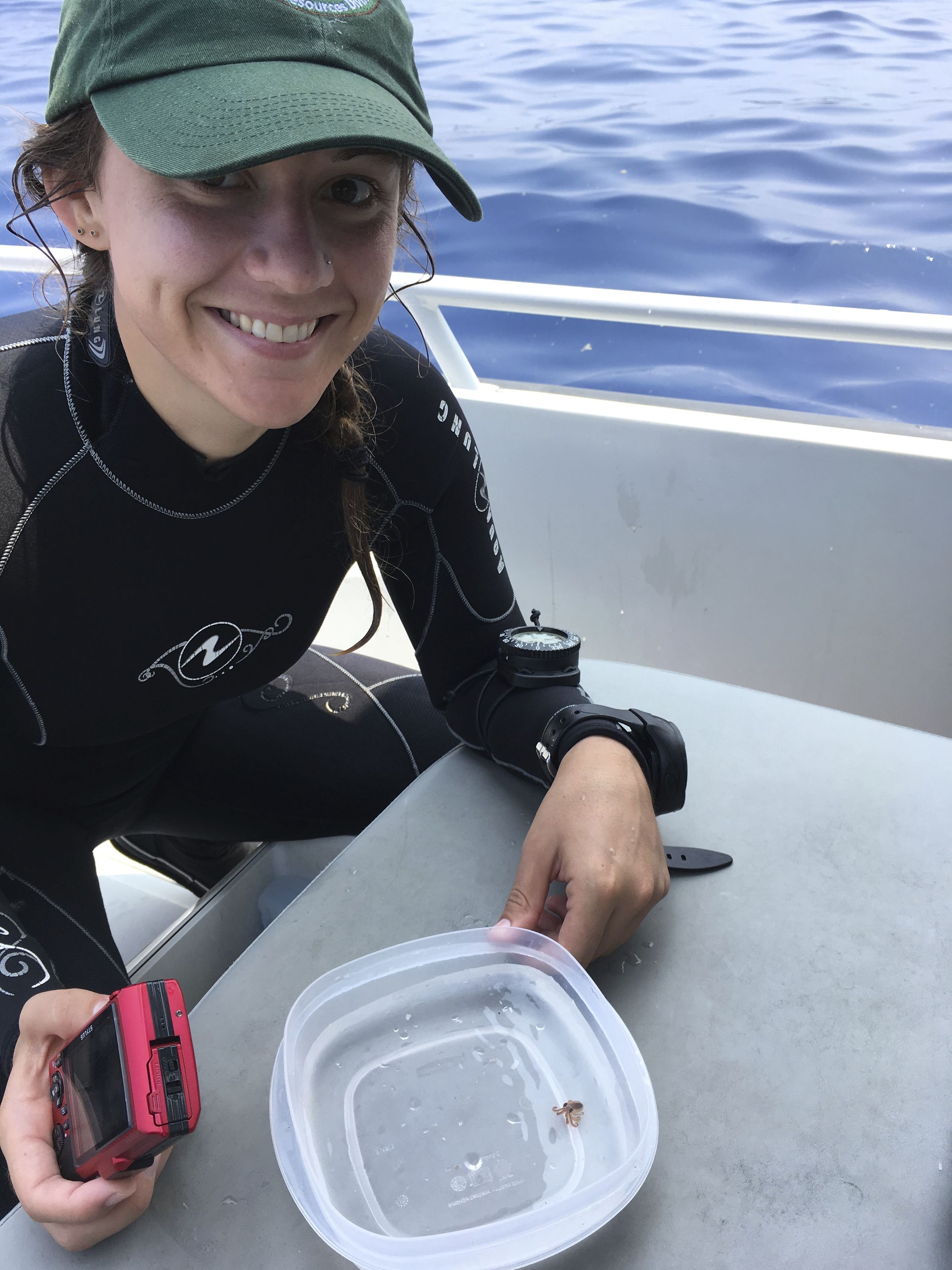This Aug. 1, 2018 photo provided by the National Park Service shows intern Ashley Pugh posing with a baby octopus inside a plastic container at Kaloko-Honokohau National Historical Park in waters off Kailua-Kona, Hawaii. (Sallie Beavers/National Park Service via AP)