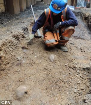 Archaeologists, including James Best pictured, believe the skulls may have washed downstream along the River Walbrook. They were found six metres under the ground below what is thought to have been a 16th century burial ground for patients of the Bedlam hospital