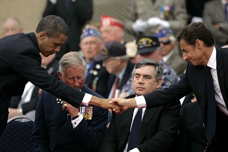 Shaking off the past: Nicolas Sarkozy greets U.S. president Barack Obama on Saturday in front of Prince Charles and Gordon Brown, but the D-Day landings were a very British effort