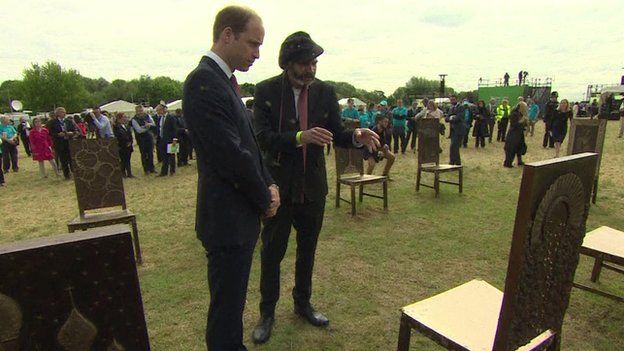 Prince William was shown an art installation of bronze chairs by Hew Locke, commissioned to mark the anniversary