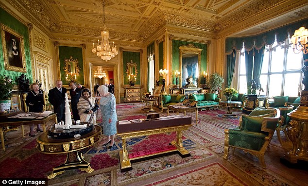 Afterwards the party moved through the Sovereign's Entrance and inside the castle for a private lunch, after which the Queen and the Duke exchanged gifts with their guests in the ornate Crimson Drawing Room.