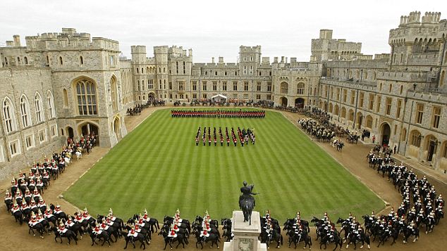 A royal welcome: The march past including members of the King's Troop Royal Horse Artillery and the Sovereign's Escort of the Household Cavalry in the grounds of Windsor Castle yesterday