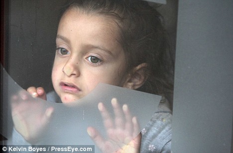 A terrified Romanian child presses her nose against the glass of a window at the church