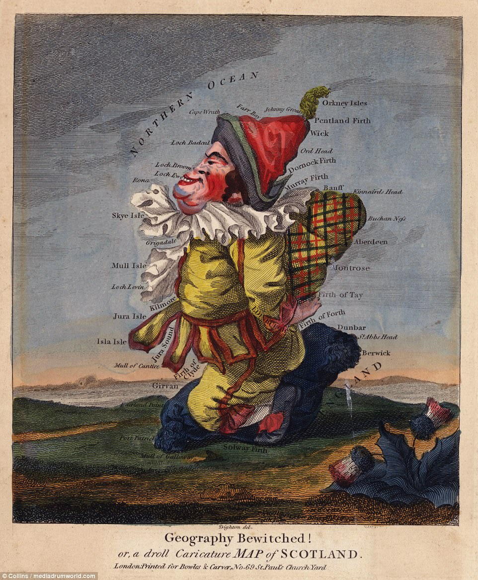 SCOTLAND, c. 1794: This was part of a set of caricature maps engraved by Robert Dighton in the late 18th century. The series - entitled Geography Bewitched! - was originally published around 1780. It was designed to amuse and also educate; the bold use of colour and caricature encouraged readers to learn about geographical locations. The map features a satirical take on a Scotsman on a landscape complete with a Scottish thistle