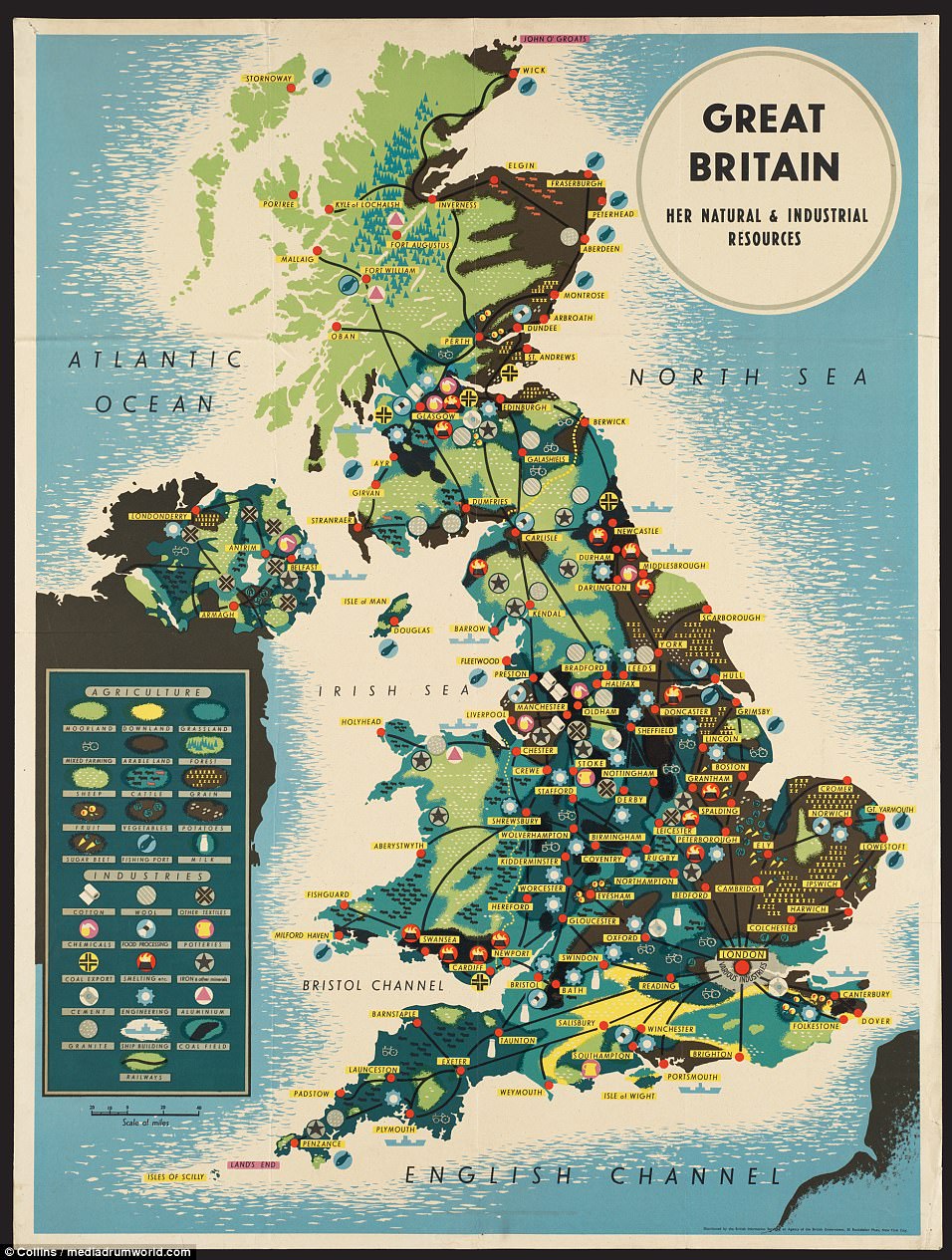 GREAT BRITAIN'S NATURAL AND INDUSTRIAL RESOURCES (circa 1939-45): This map was distributed in America by the British Information Services during the Second World War and shows the main agricultural and industrial resources of the nation during that time. It was most likely an attempt at propaganda to keep the US supporting the Allies