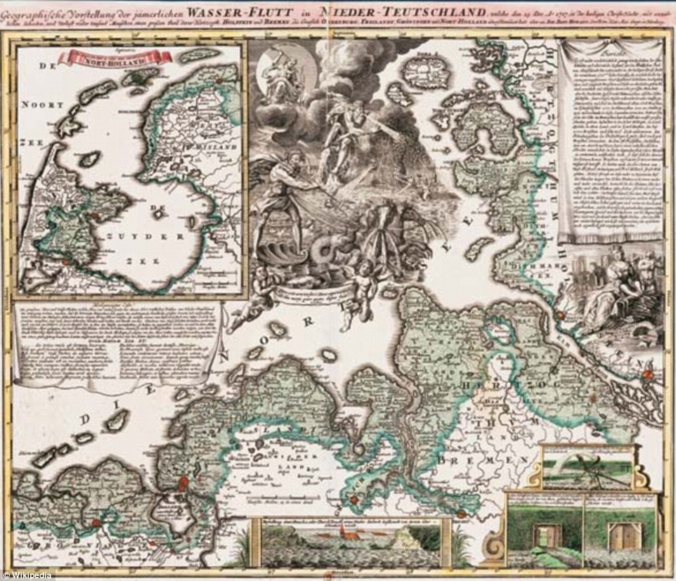 The apocalyptic weather caused enormous floods to submerge coastal areas in the Netherlands, Northern Germany and Denmark by Christmas Day. Pictured: A contemporary drawing that shows the devastation wrought in Northern Europe by the storm and flood