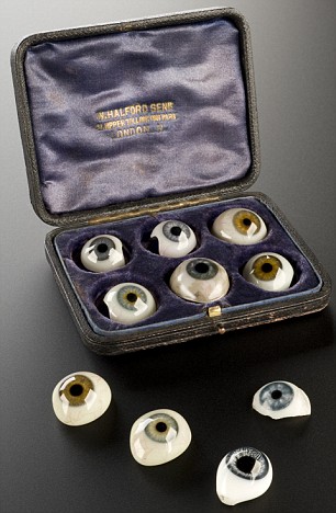 These were likely to be carried by an eye specialist or artificial eye maker to help them find the best match to the patient's remaining eye. In the 1940s, glass was replaced by plastic. Many artificial eyes ended up in railway lost-property offices