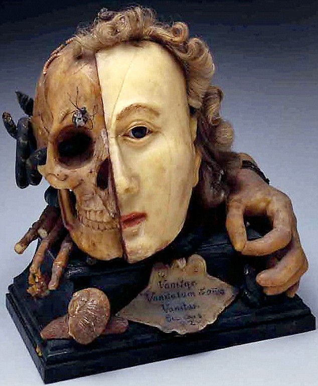 The Wax Vanitas was an educational work of art designed to remind us that human life is perilously short. This example shows a decaying human head, with a skull and worms feeding off the flesh. The other side shows the face during life. The idea was to hammer home the message that death comes all too soon to each and every one of us. This is similar to memento mori gravestones of the era depicting skulls, hourglasses and scythes
