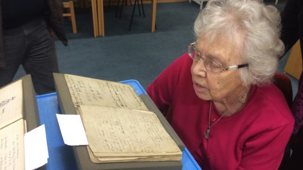 Margery Harrison views her father's entry in the visitors' book