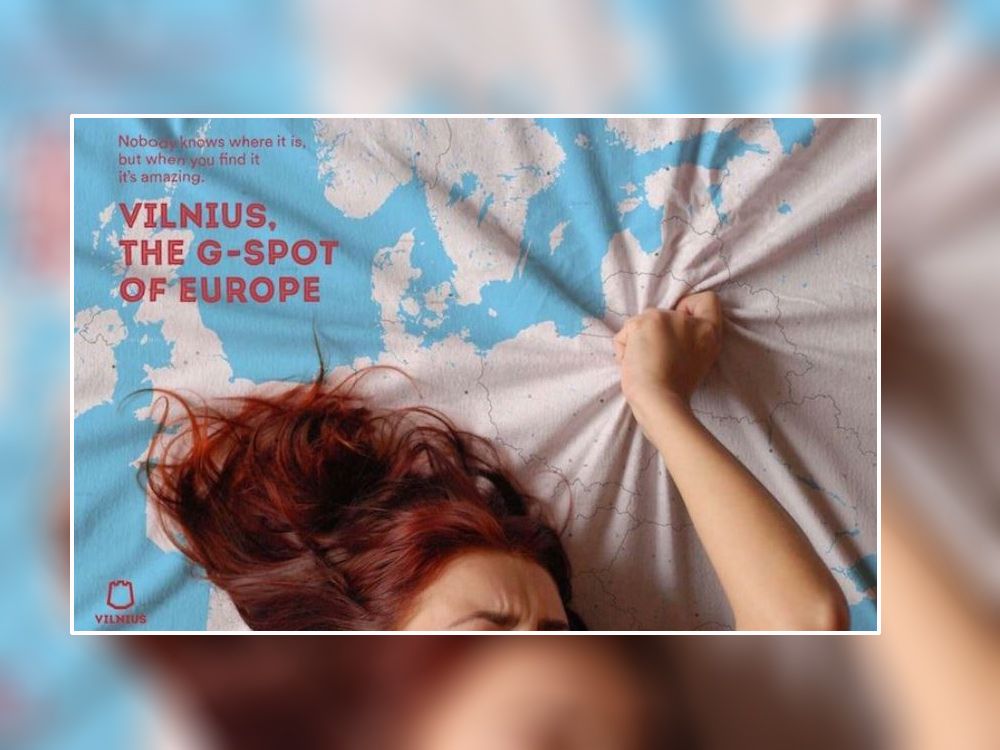 The campaign features a woman lying on what looks like a bed sheet printed with a map of Europe, her hand gripping Lithuania in a way that suggests sexual pleasure. The text above her reads: “Vilnius, the G-spot of Europe” and “Nobody knows where it is, but when you find it, it’s amazing.”