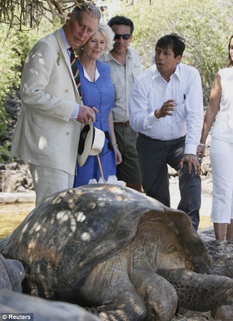 Charles became the young reptile's godparent along with the Duchess of Cornwall yesterday when they visited a tortoise breeding centre on the Galapagos Islands.