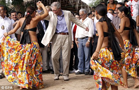 As he was welcomed into the Maguari Community's village in the Amazonian rainforest yesterday, the Prince of Wales, wearing a relaxed cream suit, beads around his neck and no tie, launched into a spot of dancing.