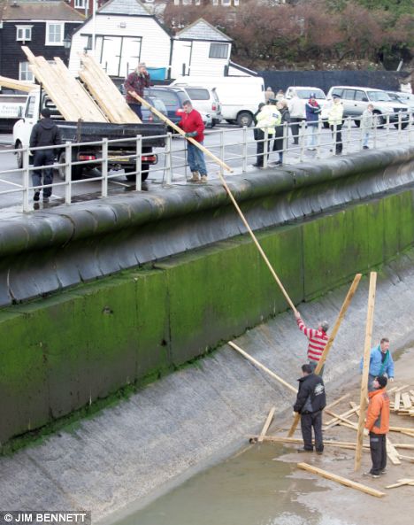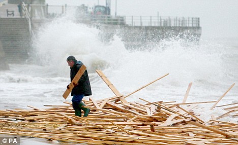 Timber! Looters brave freezing waves to clean up as tide of planks washes ashore