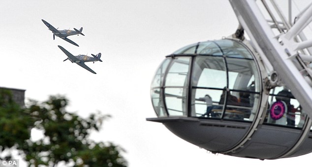 Iconic: A Spitfire and Hurricane from the Battle of Britain Memorial Flight pass by the London Eye during a flypast today