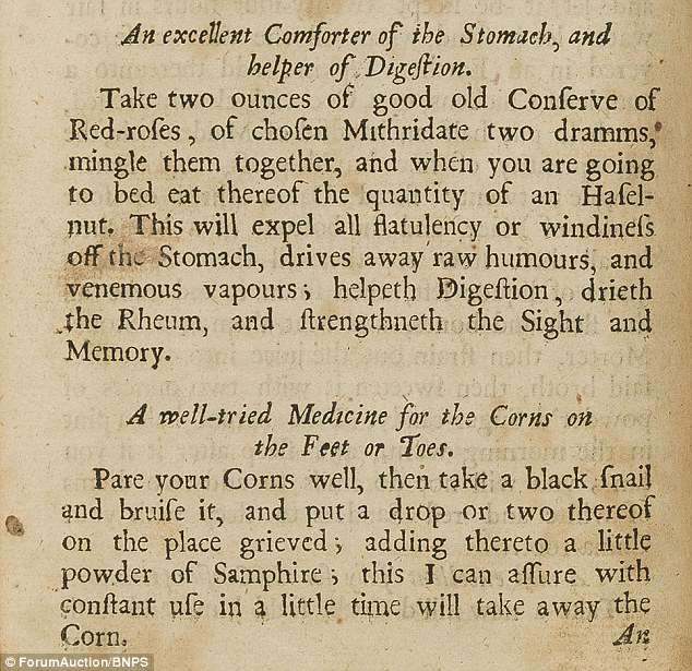 It reads: 'Take two ounces of good old conserve of red roses, of chosen Mithridate two dramms, mingle them together, and when you are going to bed eat there of the quantity of a hazelnut.