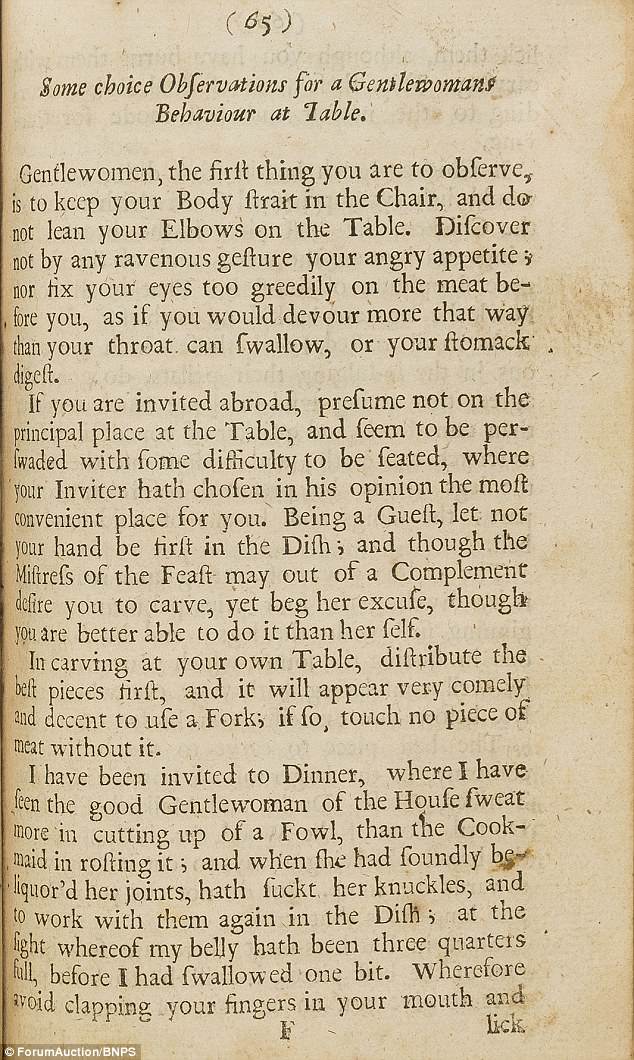 It reads: 'Gentlewomen, the first thing you are to observe, is to keep your body straight in the chair, and do not lean your elbows on the table.