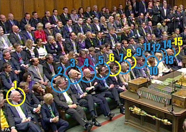 The Demservatives: Tories and the Lib Dems now sit on the same side, occupying the Government benches. 1. Sir Ming Campbell (Lib Dem; formally the party's leader) 2. Patrick McLoughlin (Tory; Chief Whip) 3. Sir George Young, 6th Baronet (Tory; Leader of the House of Commons ) 4. William Hague (Tory; Foreign Secretary) 5. David Cameron (Tory; Prime Minister) 6. Nick Clegg (Lib Dem; Deputy Prime Minister and Lib Dem leader) 7. Theresa May (Tory; Home Secretary) 8. Vince Cable (Lib Dem; Business Secretary) 9. Ken Clarke (Tory; Lord Chancellor and Justice Secretary) 10. Caroline Spelman (Tory; Environment, Food and Rural Affairs) 11. Philip Hammond (Tory; Transport Secretary) 12. Cheryl Gillan (Tory; Welsh Secretary) 13. David Willetts (Tory; Science Minister) 14. Iain Duncan Smith (Tory; Work and Pensions Secretary) 15. Danny Alexander (Lib Dem; Scottish Secretary)