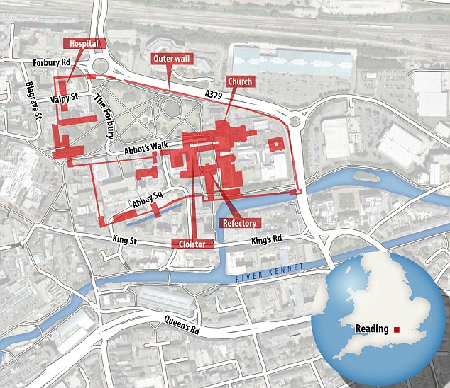 The thinking in Reading, using current estimates of the size of the abbey, is that this burial spot is located beneath a school. If the abbey is larger, it could be situated underneath either what is today a playground or car park A map of the area is pictured